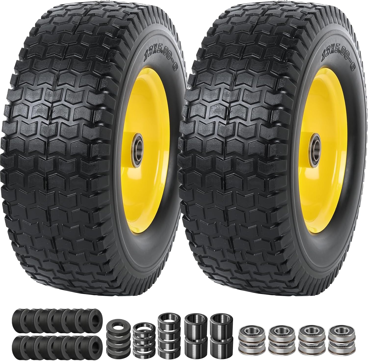 - FLAT-FREE SOLID TIRE WITH 440 LB LOAD CAPACITY: Solid hard rubber construction eliminates air pressure maintenance and puncture-related downtime. Supports up to 440 lbs dynamic load per wheel for routine mowing and lawn equipment use