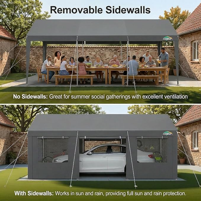 - 【Removable Side Walls & Ventilation Windows】:carports canopy 12×20 comes with 4 removable sidewalls、2 doors and 4 ventilation windows for better airflow. Designed with smooth double zippers and meticulous stitching with no visible thread lines, 12×20 car tent garage ensures durable and convenient daily use.